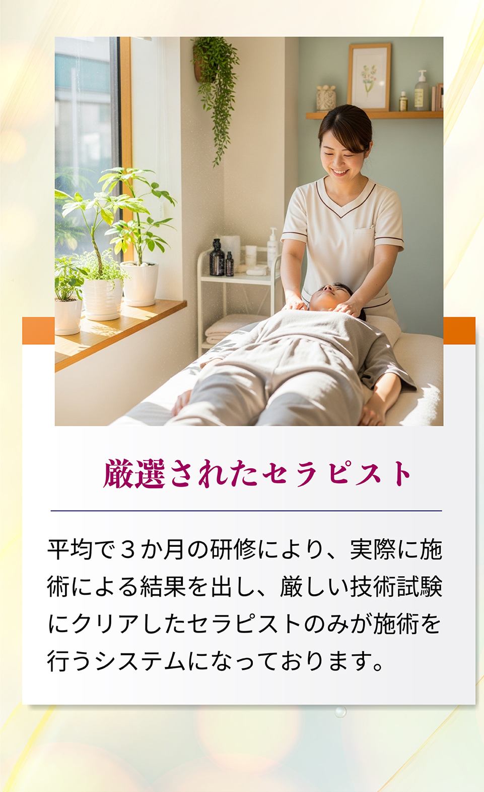 ご安心ください。エネルギー美容整体はマシーンやジェルなどは使わず、すべて手技により身体を特殊なエネルギーで整えることで、自然治癒力を高める施術です。痛みなくハードな運動や無理な施術は一切行いませんので、身体に負担をかけることもありません。