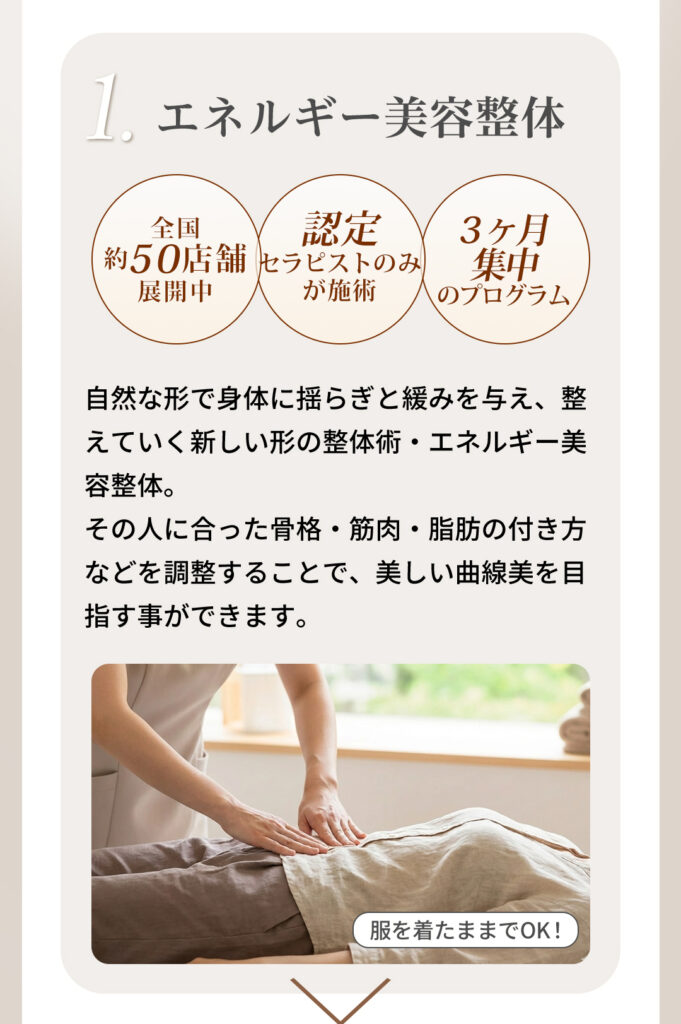 従来のエステやダイエットとは異なり、エネルギー整体は体質を根本から改善するアプローチで、プログラムが終了後も効果が持続しやすいのが特徴です。