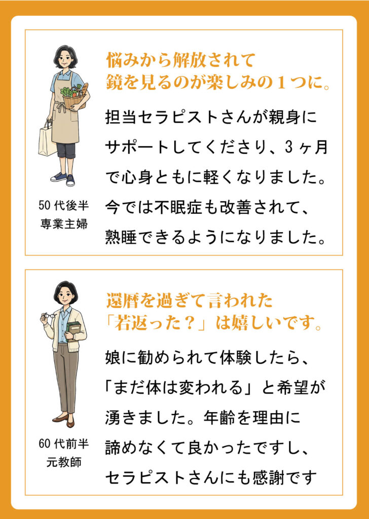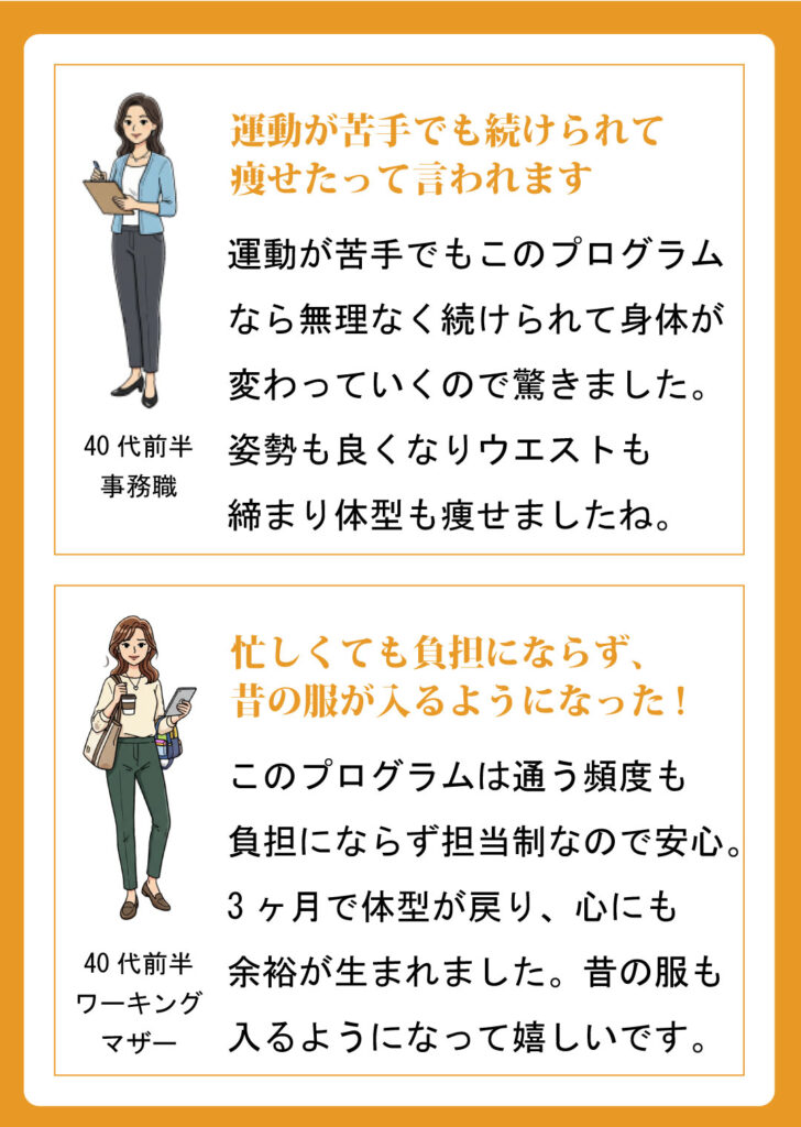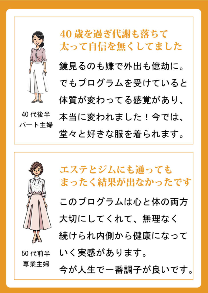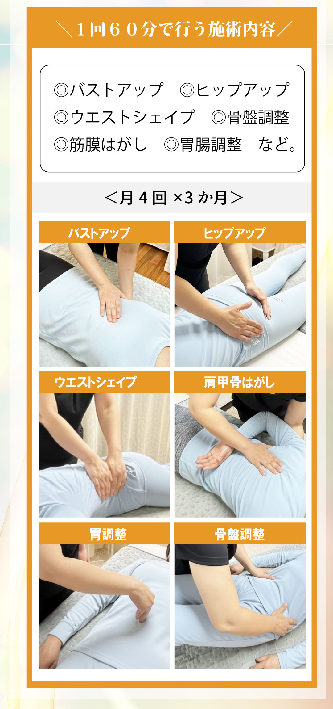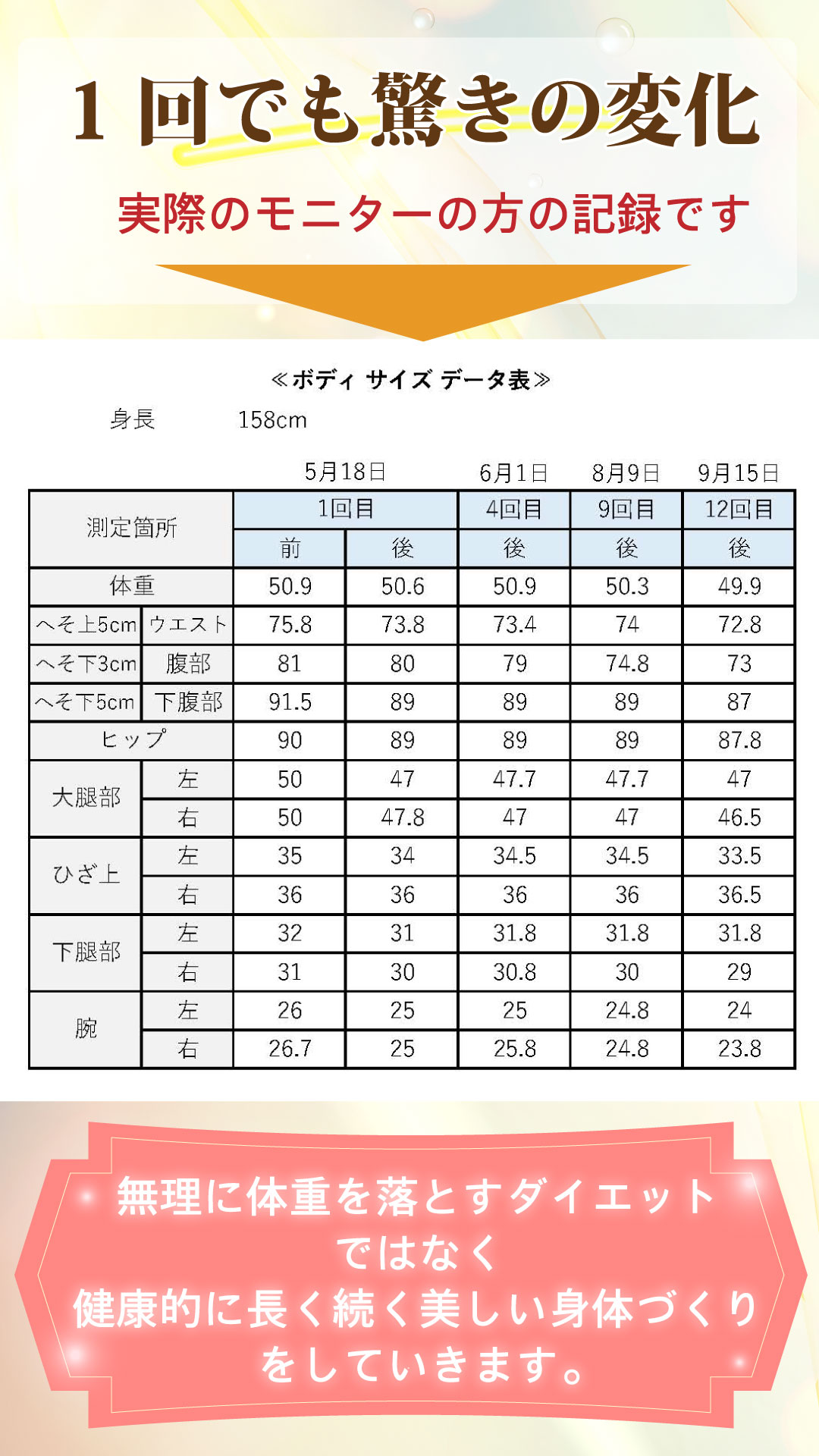 個人差はありますが、体験者の98%が効果を実感されています。体型や年齢、これまでのダイエットやボディメイクの経験に関係なく、本プログラムのエネルギー美容整体は、身体の根本に働きかけるため、どなたでも変化を感じていただけます。