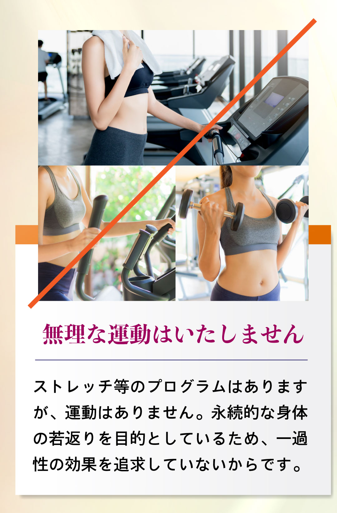 心配ありません。本プログラムでご提供する、自宅で出来る動画プログラムは、運動が苦手な方でも無理なく続けられるように設計がされています。1日15分~20分程度の軽い体操で、お客様の体力レベルに合わせて段階的に進めていきますのでご安心ください。