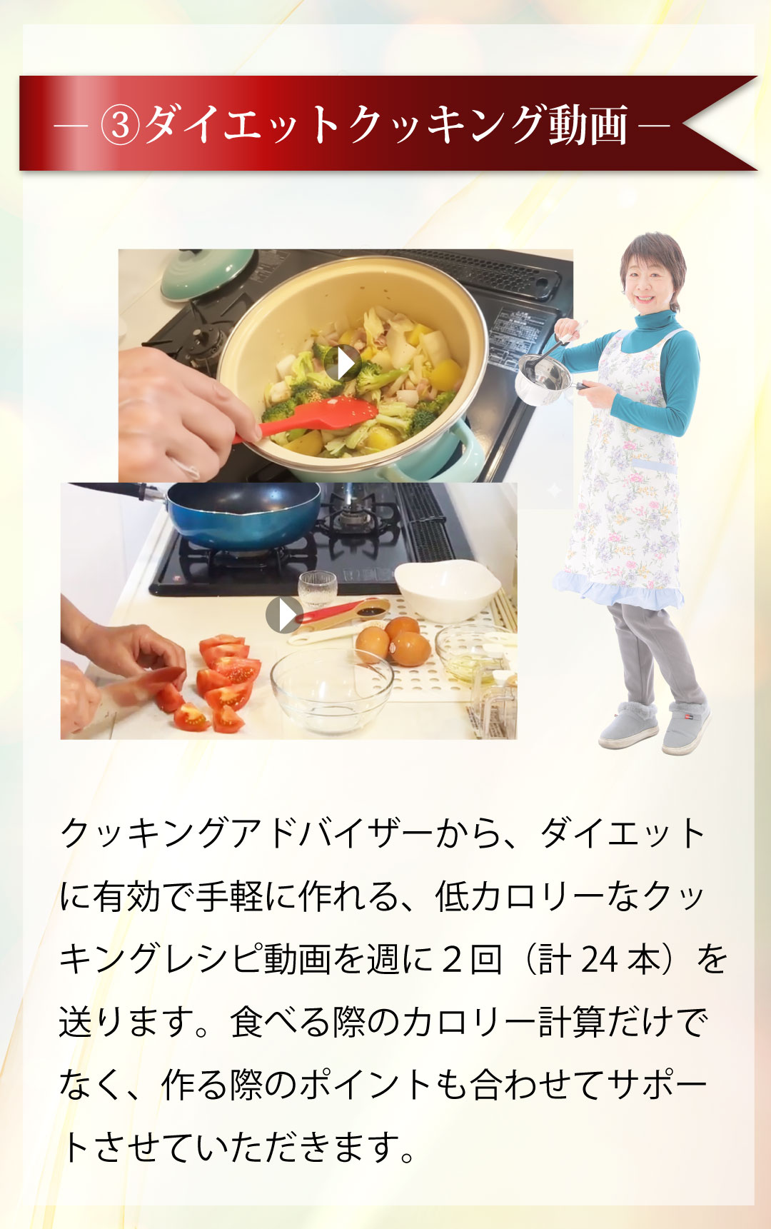 大丈夫です。 極端な食事制限や我慢を強いることはありません。食事管理アプリを使って、「何を食べてはいけないか」ではなく「何を食べると良いか」を楽しく学んでいただきます。24種類のダイエットクッキング動画で美味しく健康的なお食事を楽しみながら、無理なく体質改善していきます。