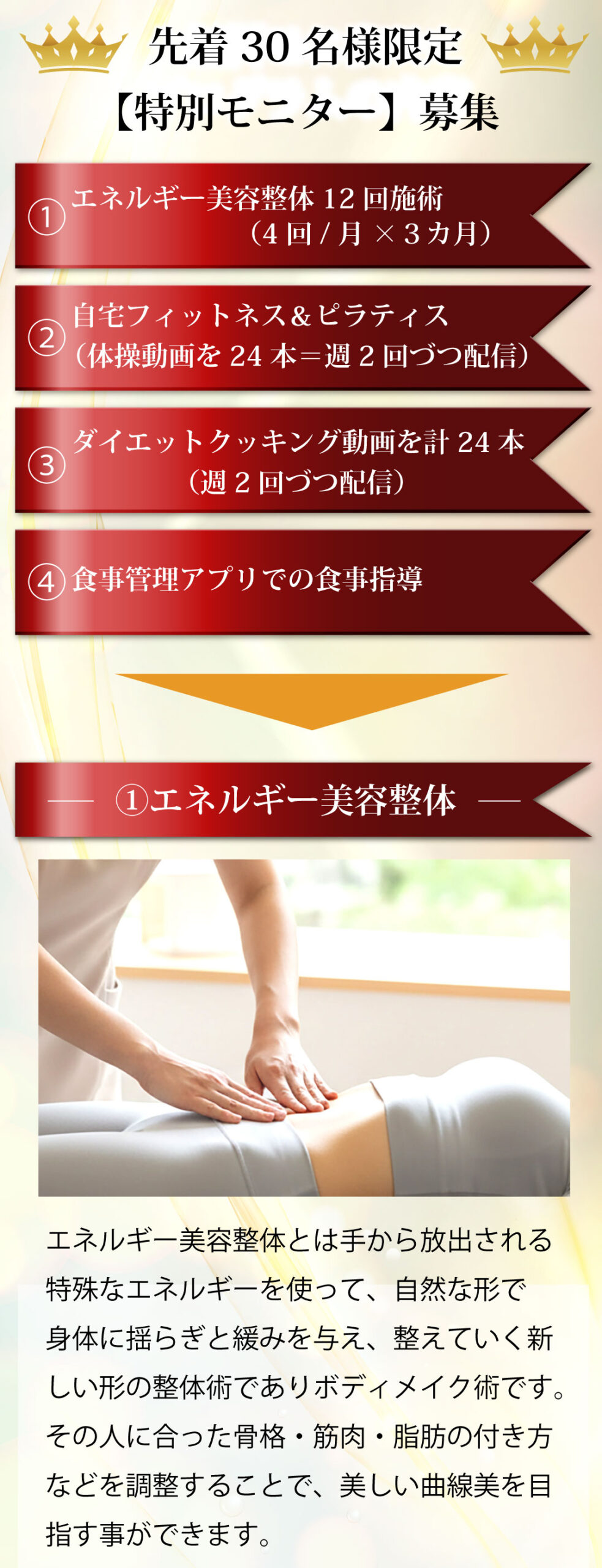 従来のエステやダイエットとは異なり、エネルギー整体は体質を根本から改善するアプローチで、プログラムが終了後も効果が持続しやすいのが特徴です。