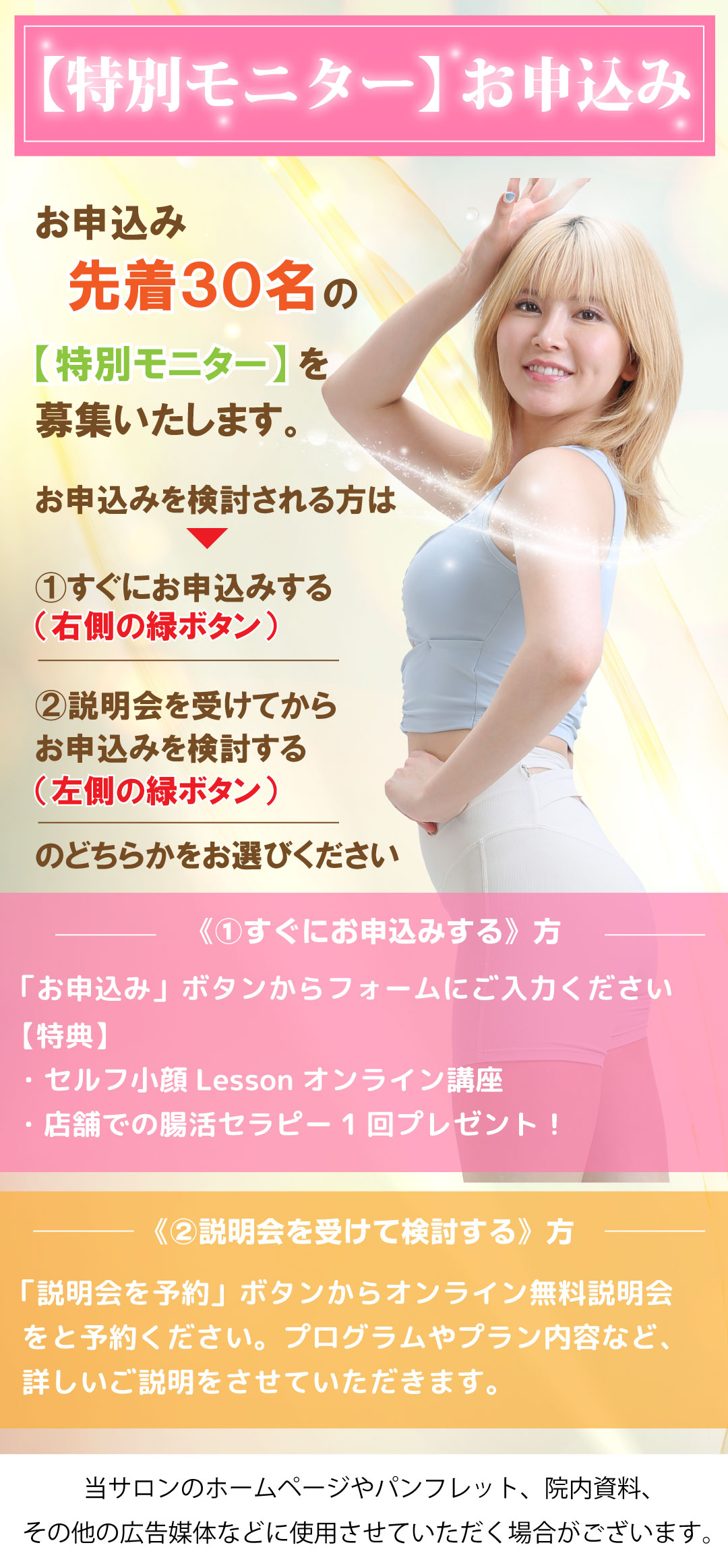 現在、サロンの予約がほぼ満席状態で、通常の新規受付を停止しております。モニター価格は通常料金より安くご設定させていただいており、また通常受付が再開するタイミングも未定ですので、是非この機会に限定有料モニターをご検討ください。